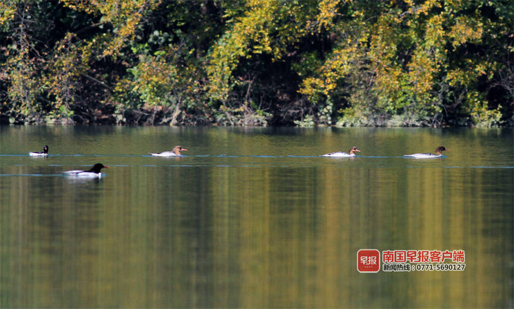 “几年前,每年零星发现一两只,开始叫不上名字,很难拍到,没有过多关注。去年成群来,我们查询发现是中华秋沙鸭。“百色市澄碧河水库管理中心何主任介绍,它们一般是头年的11月左右到来,次年的3月份左右离开,时间长达5个月。今年10月底到来的种群,数量明显增多,初步观测有数十只。