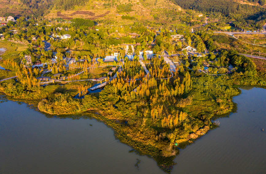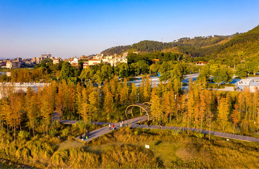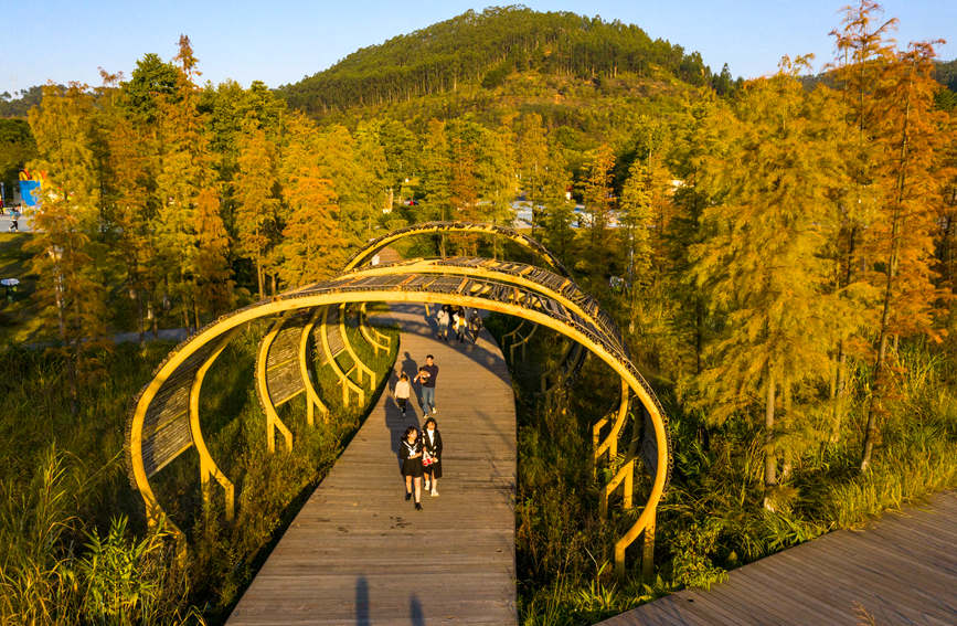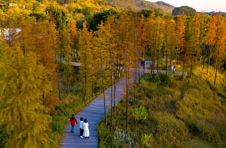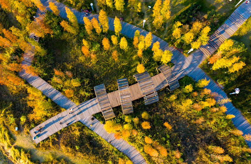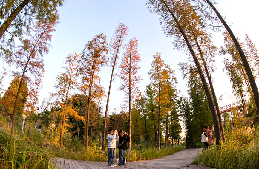 湿地公园内,层林尽染,五彩斑斓,景美如画,成为市民休闲娱乐的好去处。