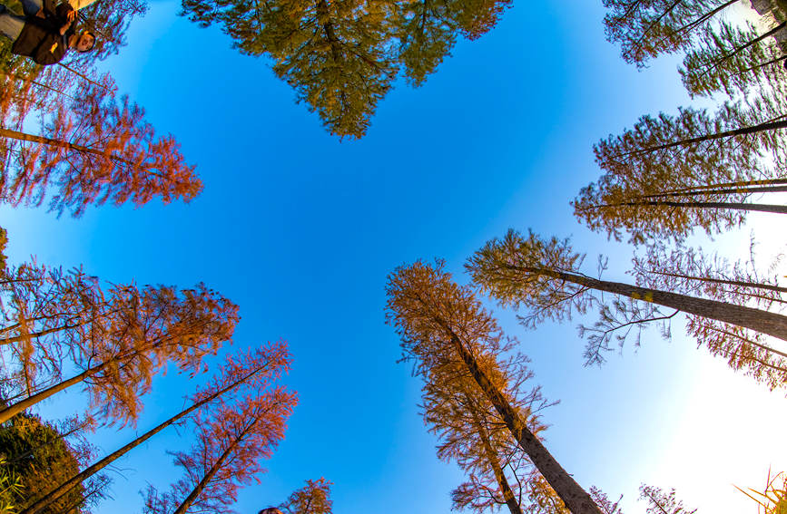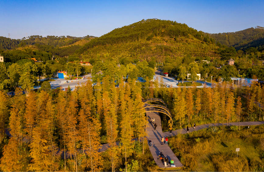 初冬时节,广西梧州市龙圩区苍海湖湿地公园内,层林尽染,五彩斑斓,景美如画,成为市民休闲娱乐的好去处。