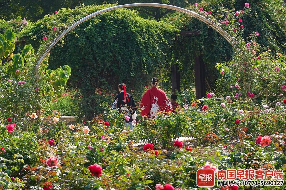 ▲12月13日下午,两位市民穿着汉服在月季园内散步。 南国早报客户端记者 邹财麟 摄