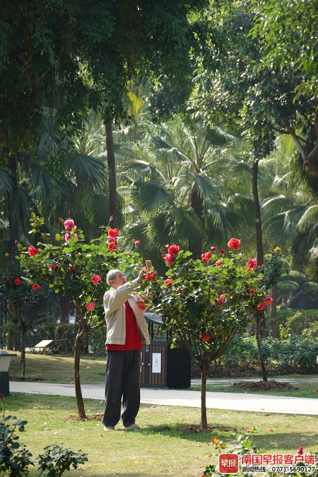 ▲12月14日,市民在南湖公园内近距离欣赏月季花。 南国早报客户端记者 邹财麟 摄
