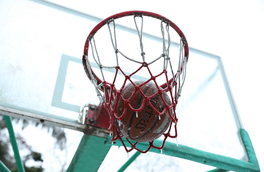 运动场的篮筐也结了冻。龚普康摄