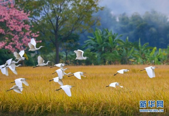 初冬时节,收获的旋律仍在八桂大地上回响。在广西横县,晚稻迎来收获季,广袤的田野里一片金黄,成群的飞鸟掠过金色的稻田,粉嫩的花儿在田边绽放,一台台收割机忙碌穿梭,呈现一幅美丽丰收画卷,令人心醉。...