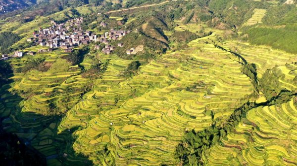 金秋时节,三江侗族自治县同乐苗族乡高武村、桂书村的连片梯田在夕阳的映射下格外金黄,与周边特色民居、翠绿山林、蜿蜒道路交相辉映,构成一幅幅迷人的秋景图,美不胜收。(龚普康)...