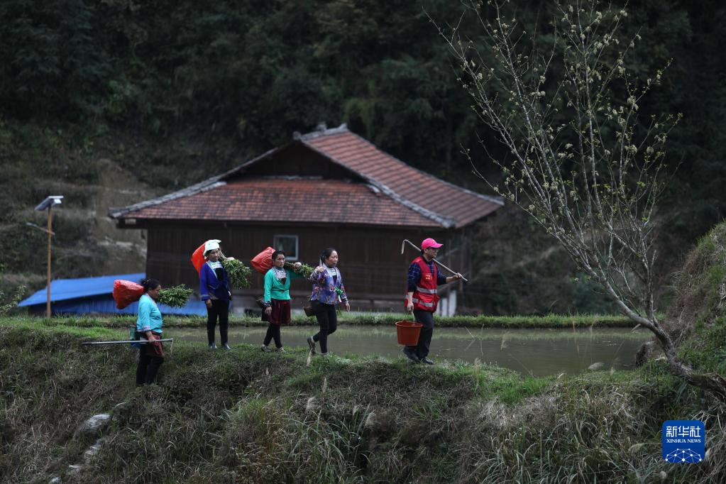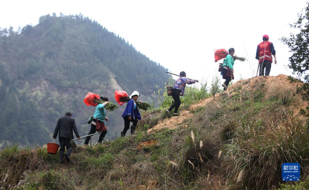 3月17日,在广西柳州市融水苗族自治县杆洞乡党鸠村,驻村工作队员和村民上山种树。