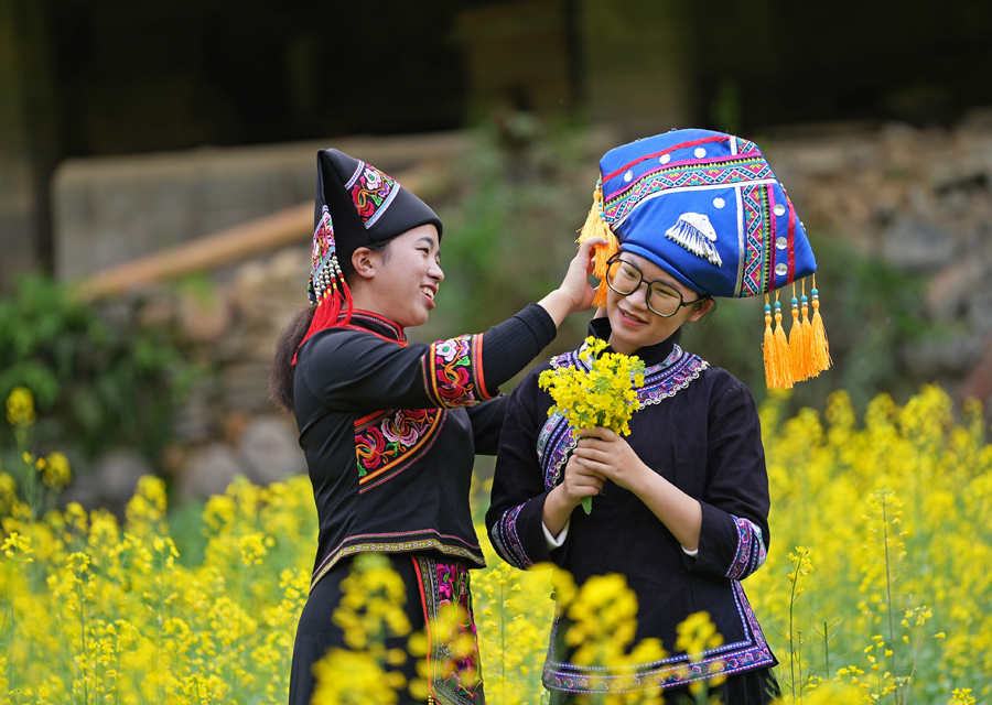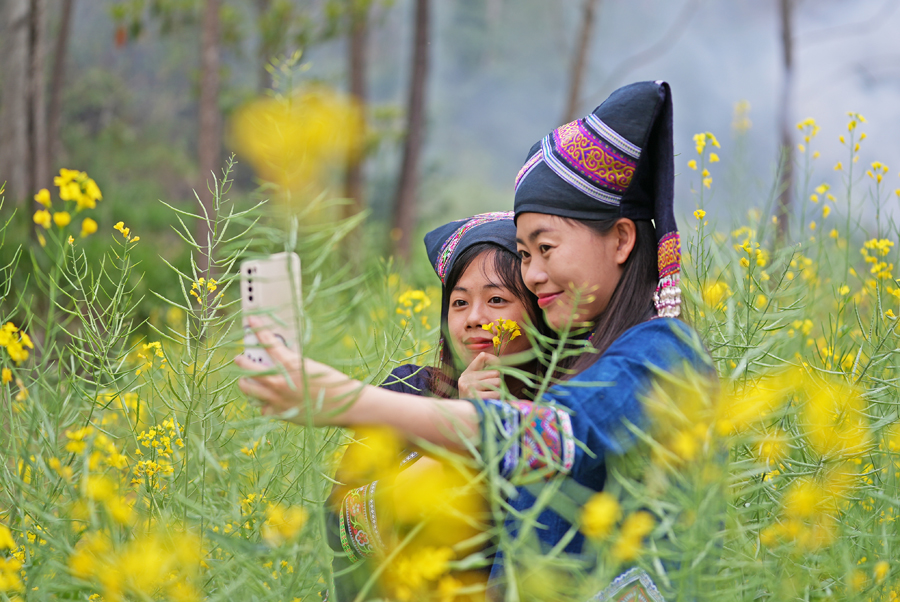 游客穿着民族服装在油菜地里赏花。黄少将 摄