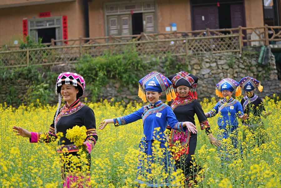 游客穿着民族服装在油菜地里赏花。黄少将 摄