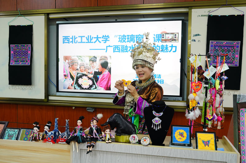 6月19日,融水苗族自治县民族中学苗绣室10多名学生与远在千里之外的西北工业大学工程实践训练中心国际化创新实践基地的20名学生通过线上和线下学习苗族刺绣。