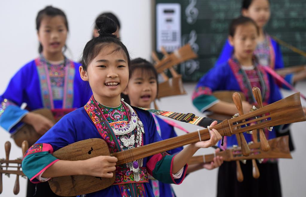 江川小学学生在非遗课堂上弹唱侗族琵琶歌。(新华社记者陆波岸摄)