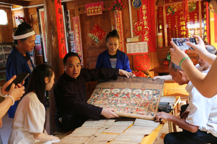 杨会光(左三)搜集到侗族地区珍贵的清代道、佛、儒教经书和画一批。