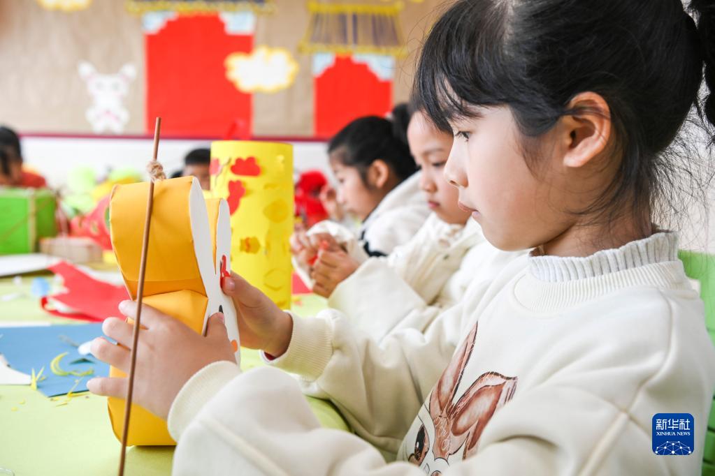 2月2日,在广西兴业县城南小学,学生们在制作元宵节的花灯。