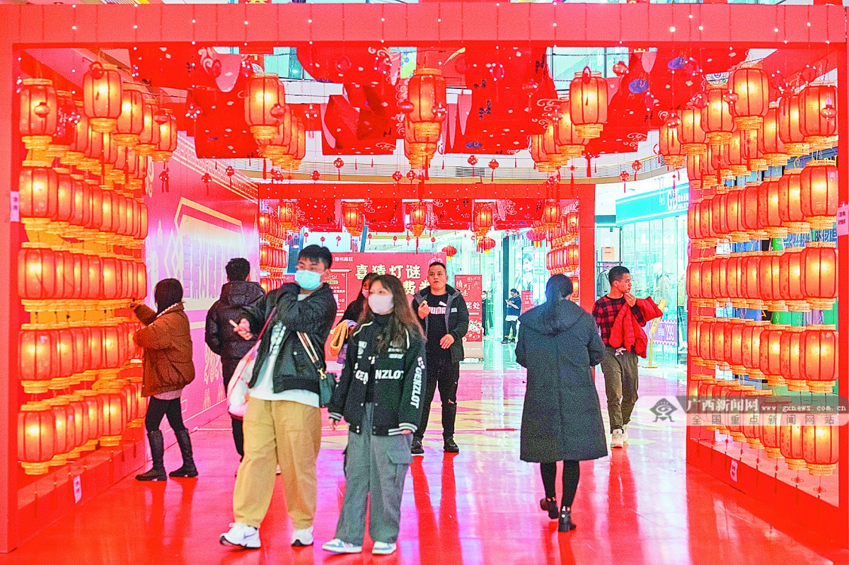 2月4日,在梧州市一家商场,市民在观赏花灯。元宵佳节期间,该市在公园、广场、街道等场所悬挂花灯,营造浓厚的节日氛围。何华文 摄