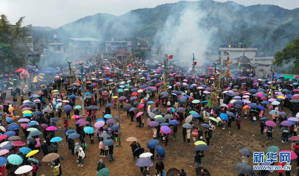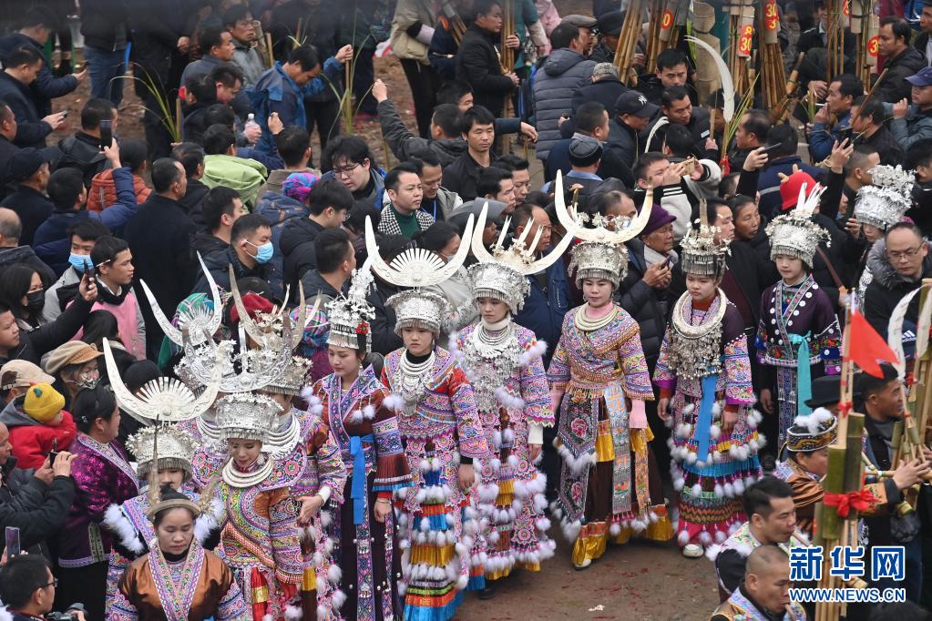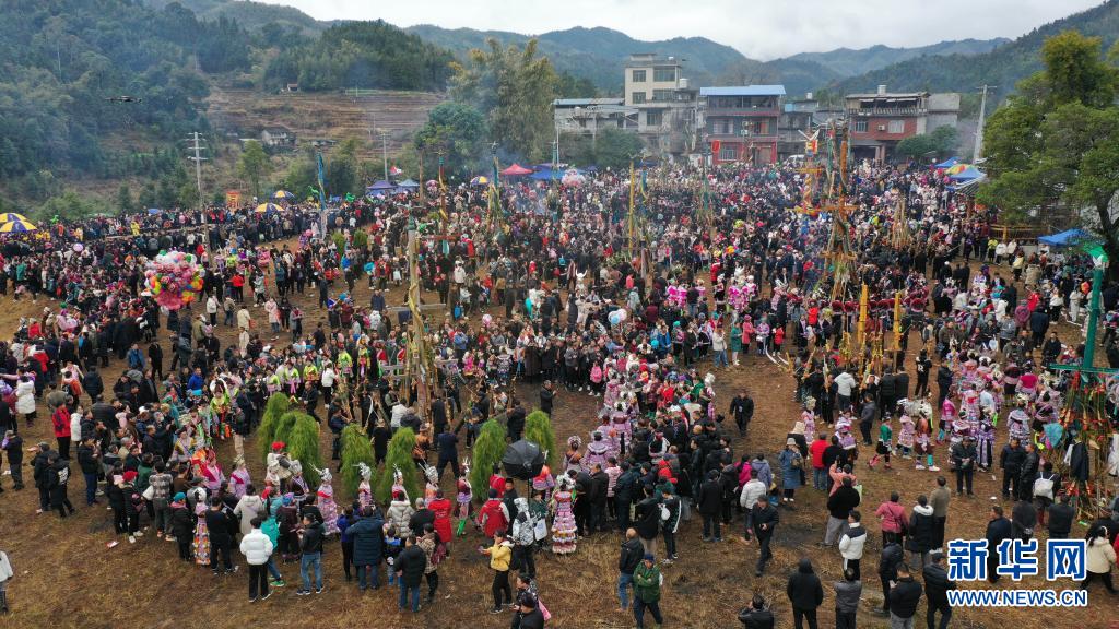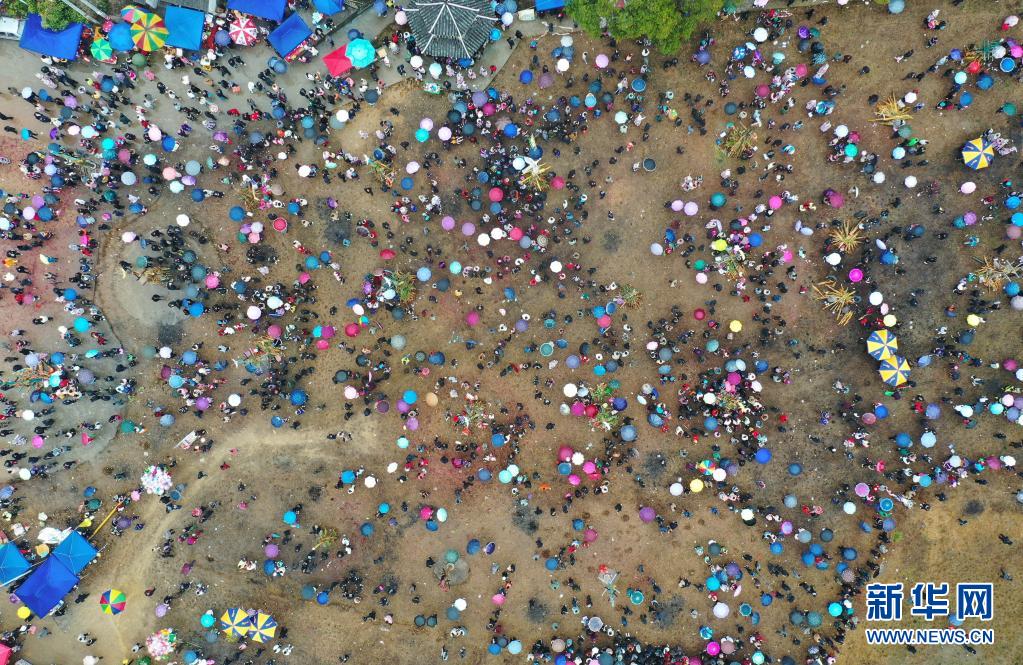 2月6日,在融水苗族自治县香粉乡十六古龙坡会上,当地群众和游客在观赏表演(无人机照片)。