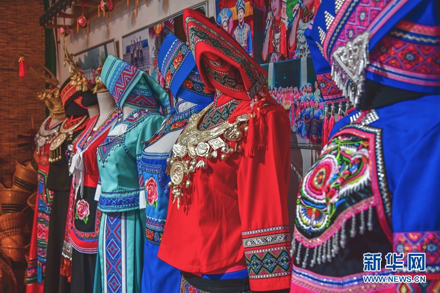 近日,在广西忻城县壮锦生产基地里,工人们正在制作壮锦服饰。