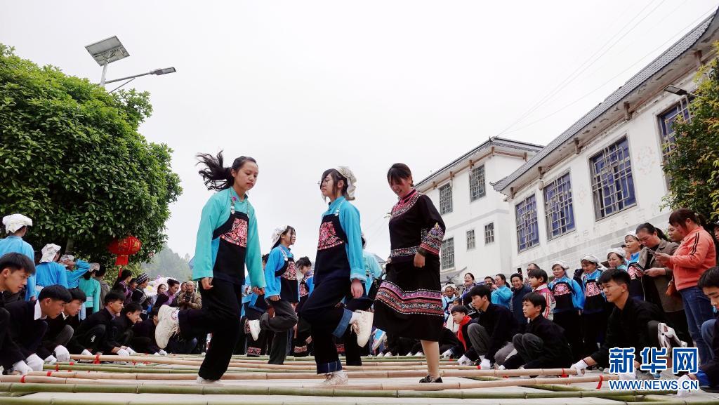 4月1日,在天峨县三堡桐花节上,居民跳起欢快的竹竿舞。
