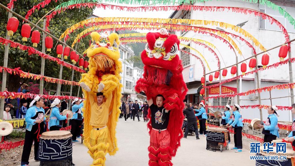 4月1日,艺人在天峨县三堡桐花节上表演舞狮。