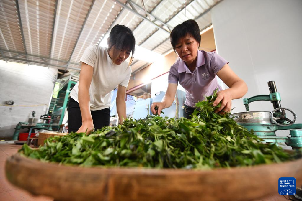 6月7日,在苍梧县六堡镇山坪村,祝雪兰(右)在制茶。