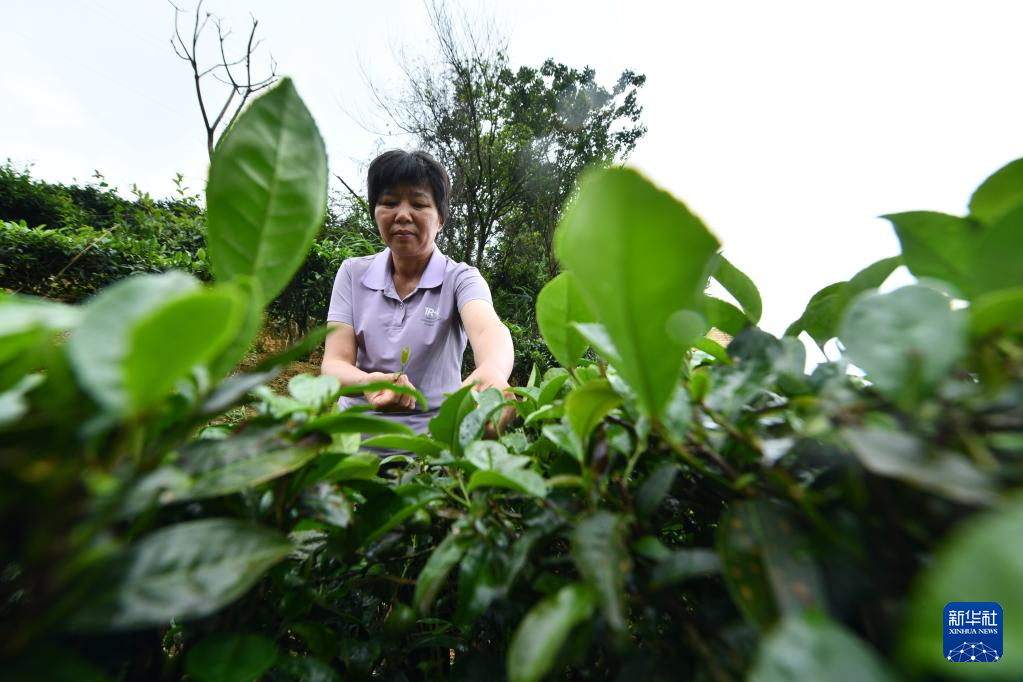 6月7日,在苍梧县六堡镇山坪村,祝雪兰(中)和村民们在采茶。