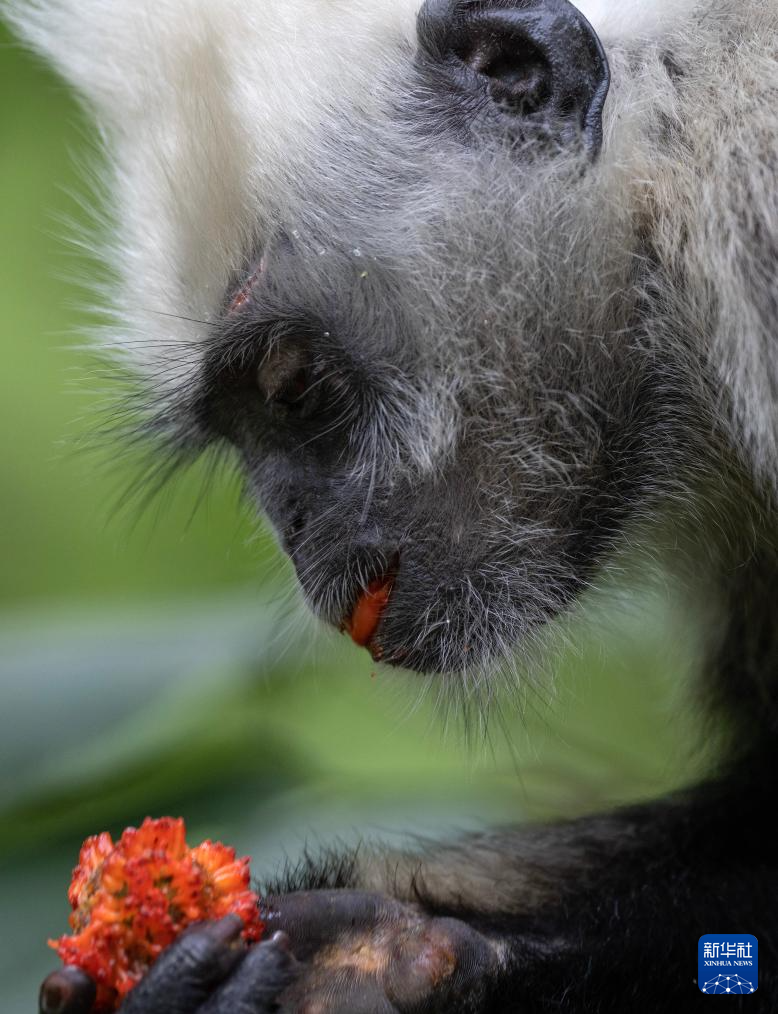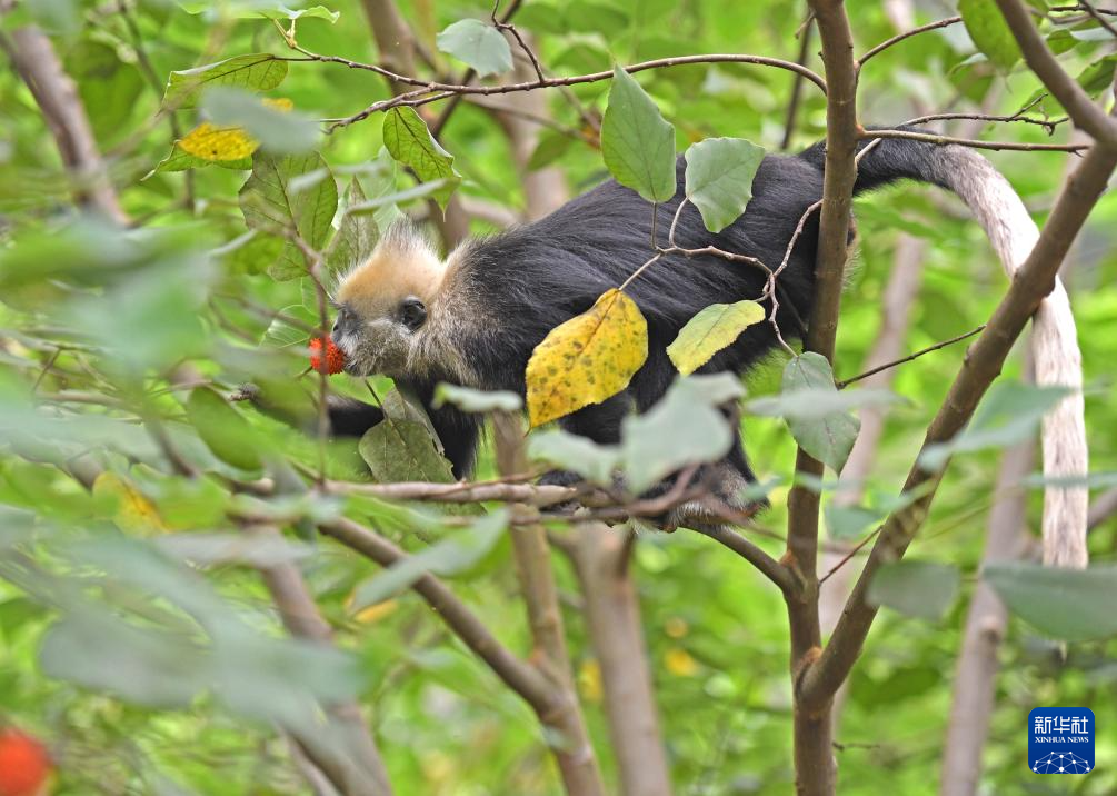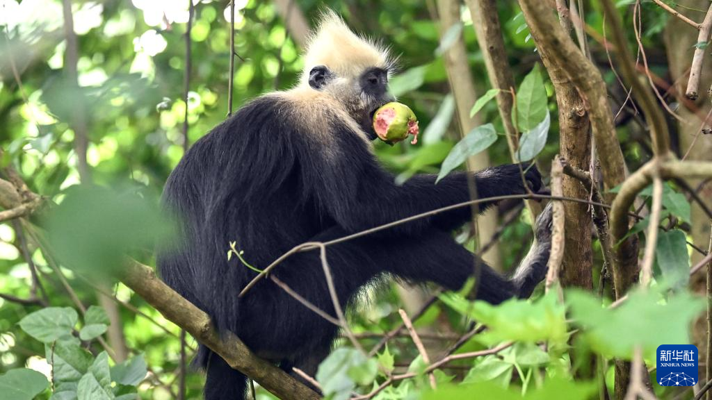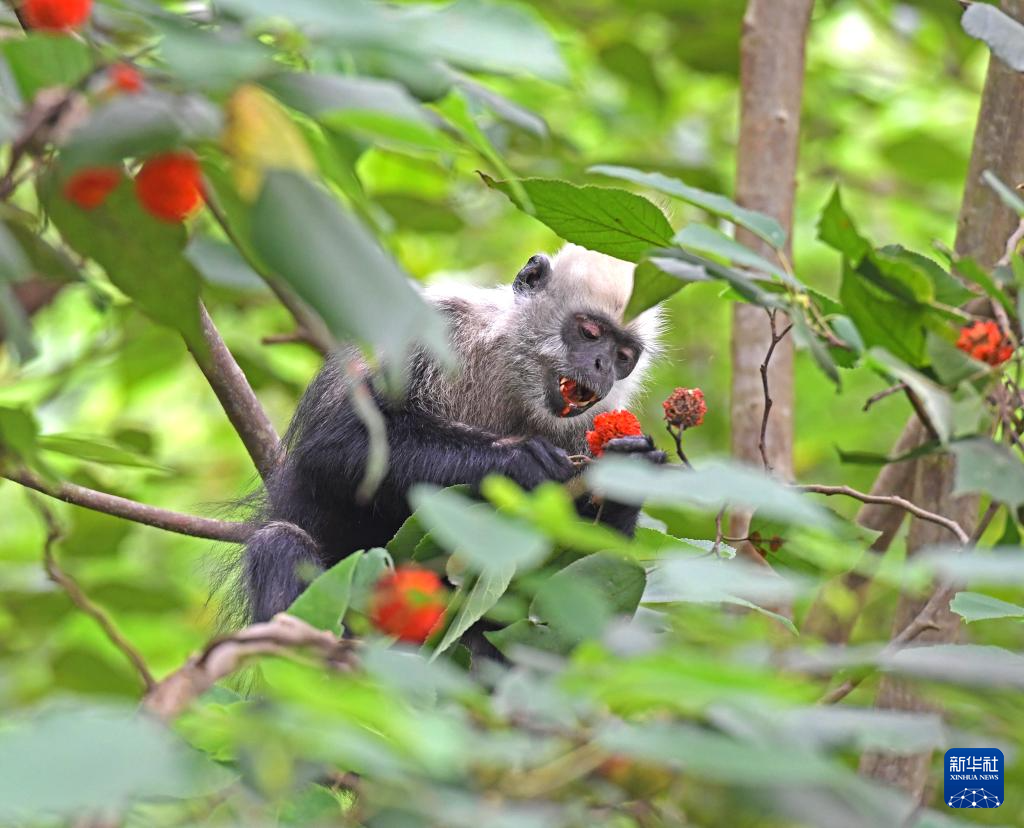 一只白头叶猴在食用鲜果(8月4日摄)。