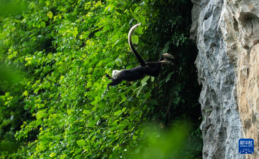 一只白头叶猴从悬崖上跃向树林(8月5日摄)。