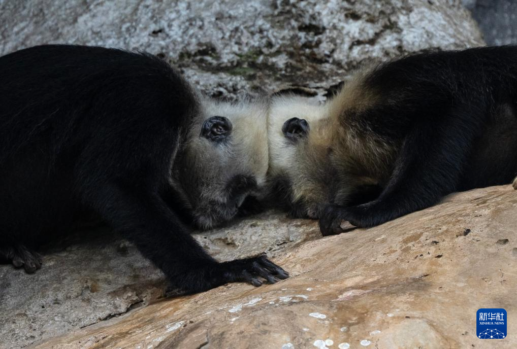 两只白头叶猴在岩石上休憩(8月5日摄)。