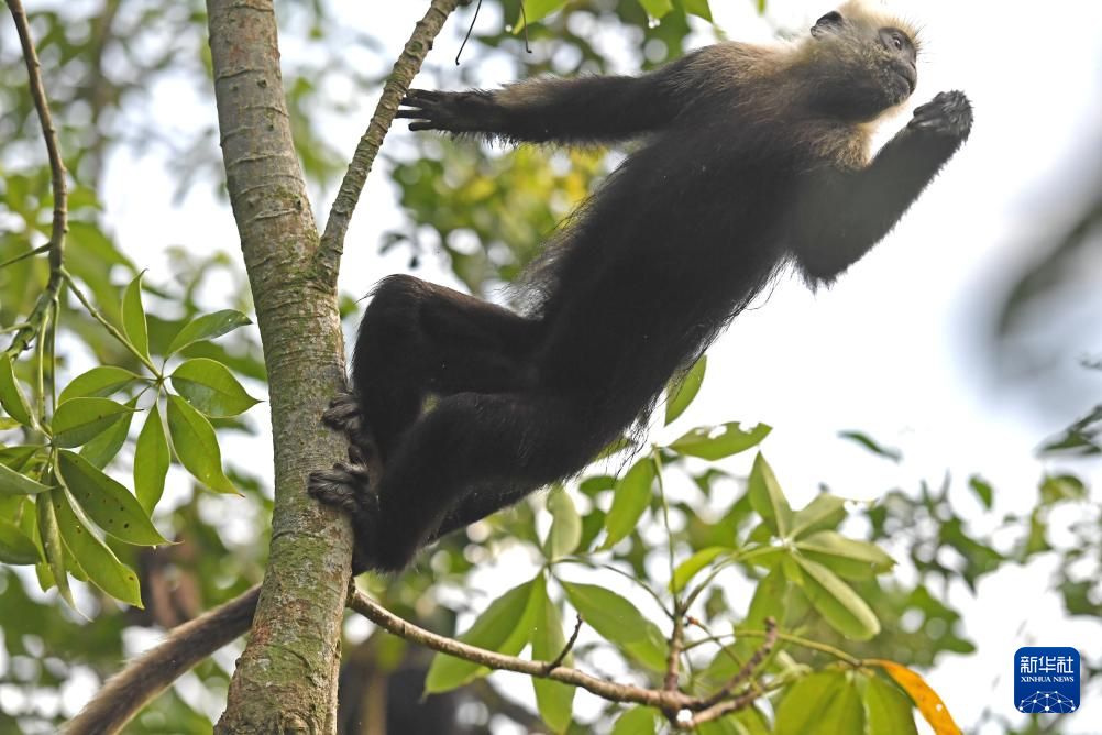 一只白头叶猴在林间跳跃(8月5日摄)。