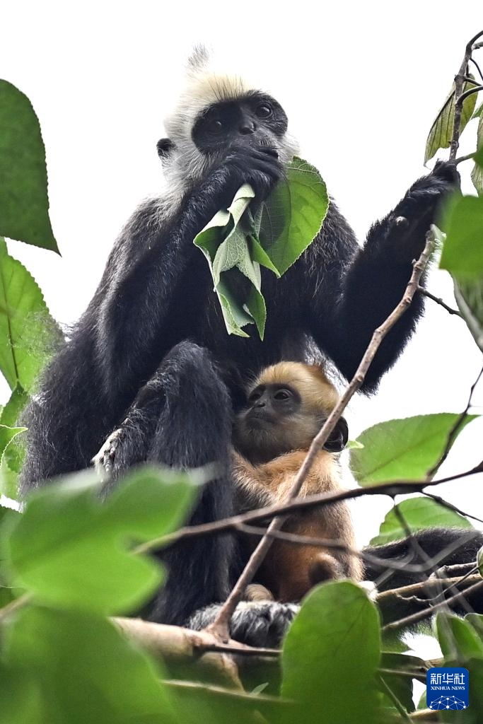 一只白头叶猴带着幼猴觅食(8月4日摄)。