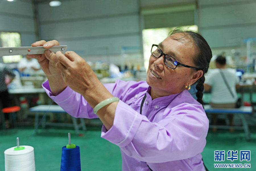 在融水洞头村洞头轻纺就业帮扶工厂,一名妇女正在缝制衣服。