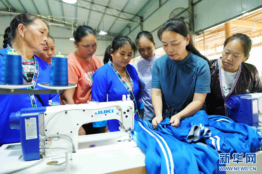 在融水洞头村洞头轻纺就业帮扶工厂,技术员(右)指导一位刚上岗的农家女缝制衣服。