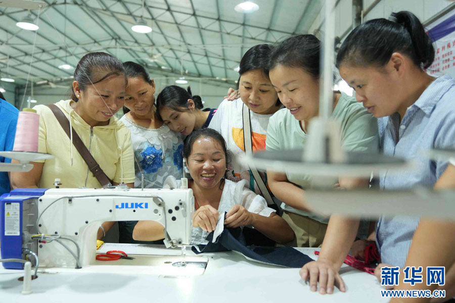 在融水洞头村洞头轻纺就业帮扶工厂,准备进厂务工的农家女观摩一位熟练工缝制衣服。
