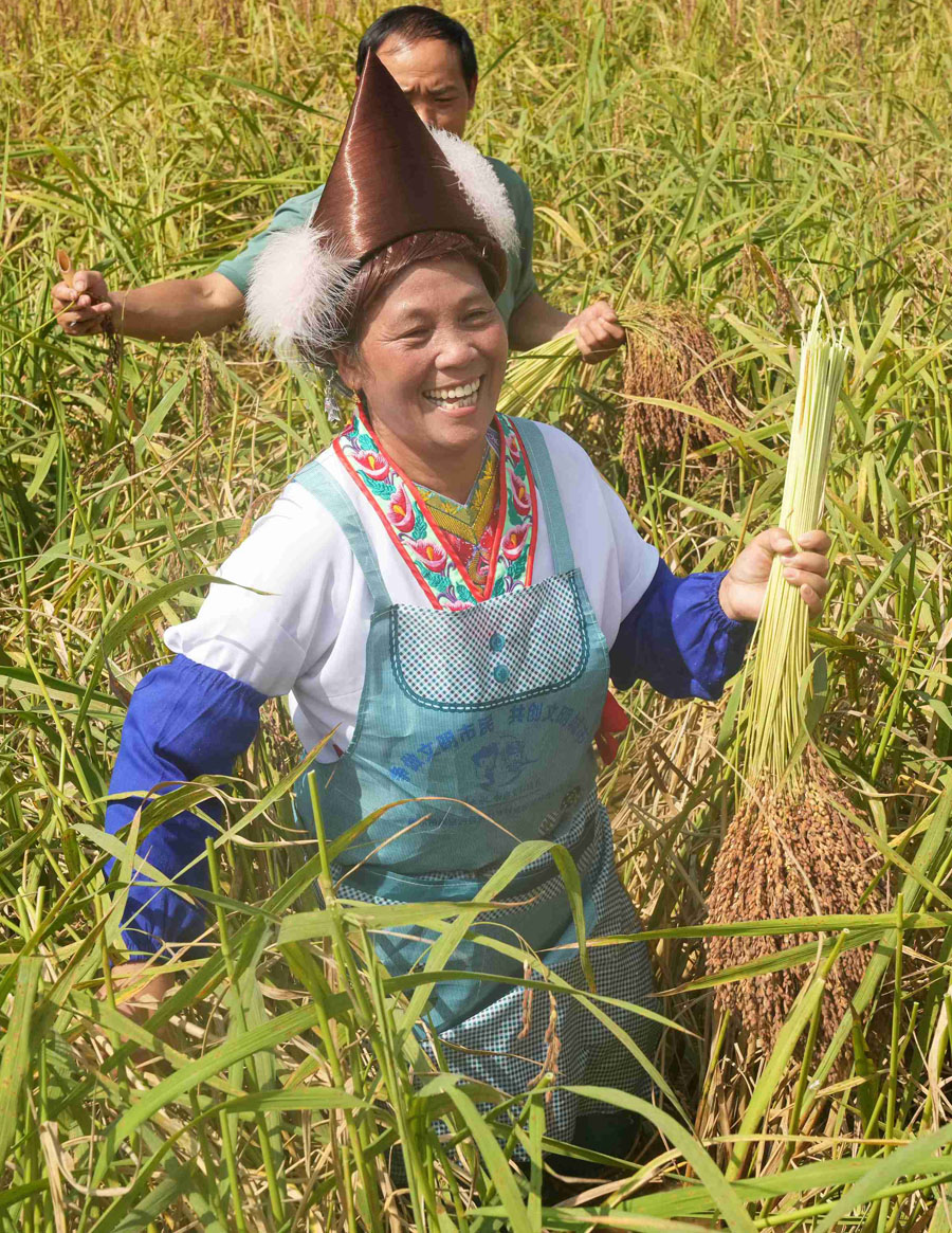 在广西柳州市融水苗族自治县红水乡,村民把刚剪下的糯稻带到田埂准备扎成禾把。