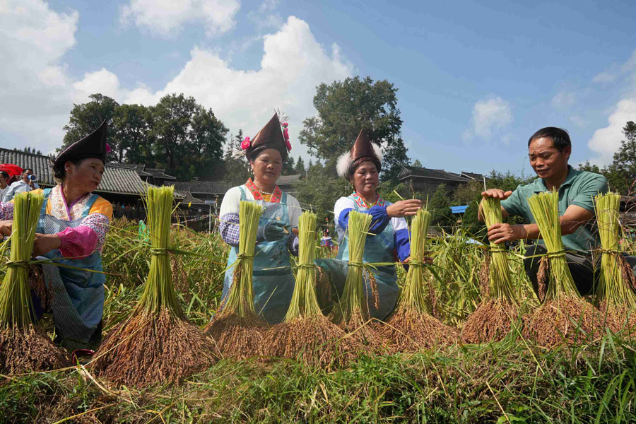 金秋时节,广西柳州市融水苗族自治县大苗山种植的传统糯稻进入成熟期,村民们按照传统耕作方式,进行剪禾、扎禾把、晒禾把等,确保颗粒归仓。(龙涛)