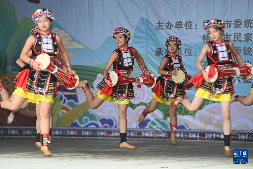 3月25日,在梧州市苍梧县六堡镇山坪村,演员们在开茶节里表演瑶族长鼓舞。