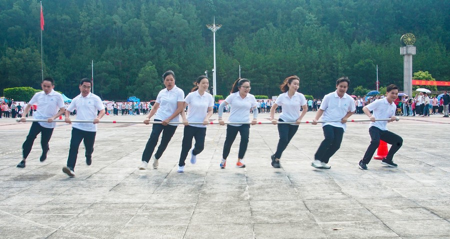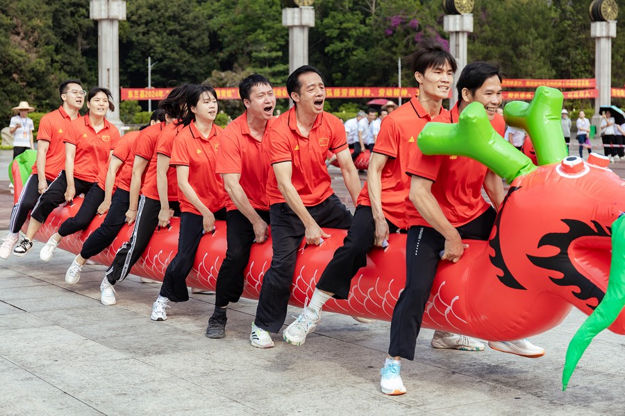 在比赛活动现场,背篓绣球、旱地龙舟等民族体育和趣味运动妙趣横生,参赛队员们团结协作、配合默契,共同展现运动的魅力。 (覃莉娱)