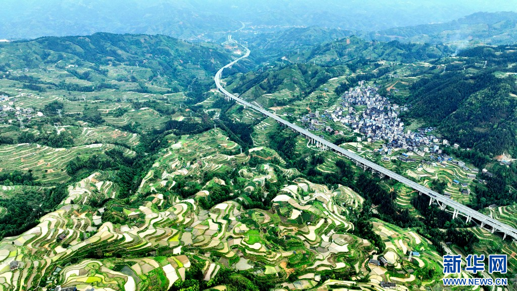 近日,在广西三江侗族自治县独峒镇,新耕作的梯田蓄水充盈,宛若层层明镜遍布山间,与绿意盎然的田野、独具特色的侗寨民居、穿梭而过的高速公路相映成趣,美不胜收。(龚普康 梁秀明)