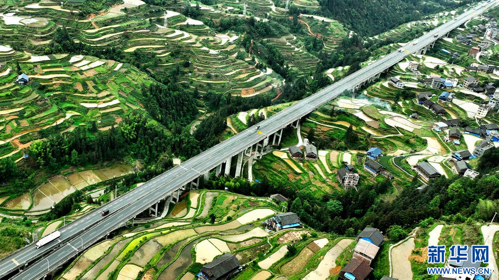 高速公路从梯田间穿梭而过,构成了一幅绿意盎然的春日画卷。