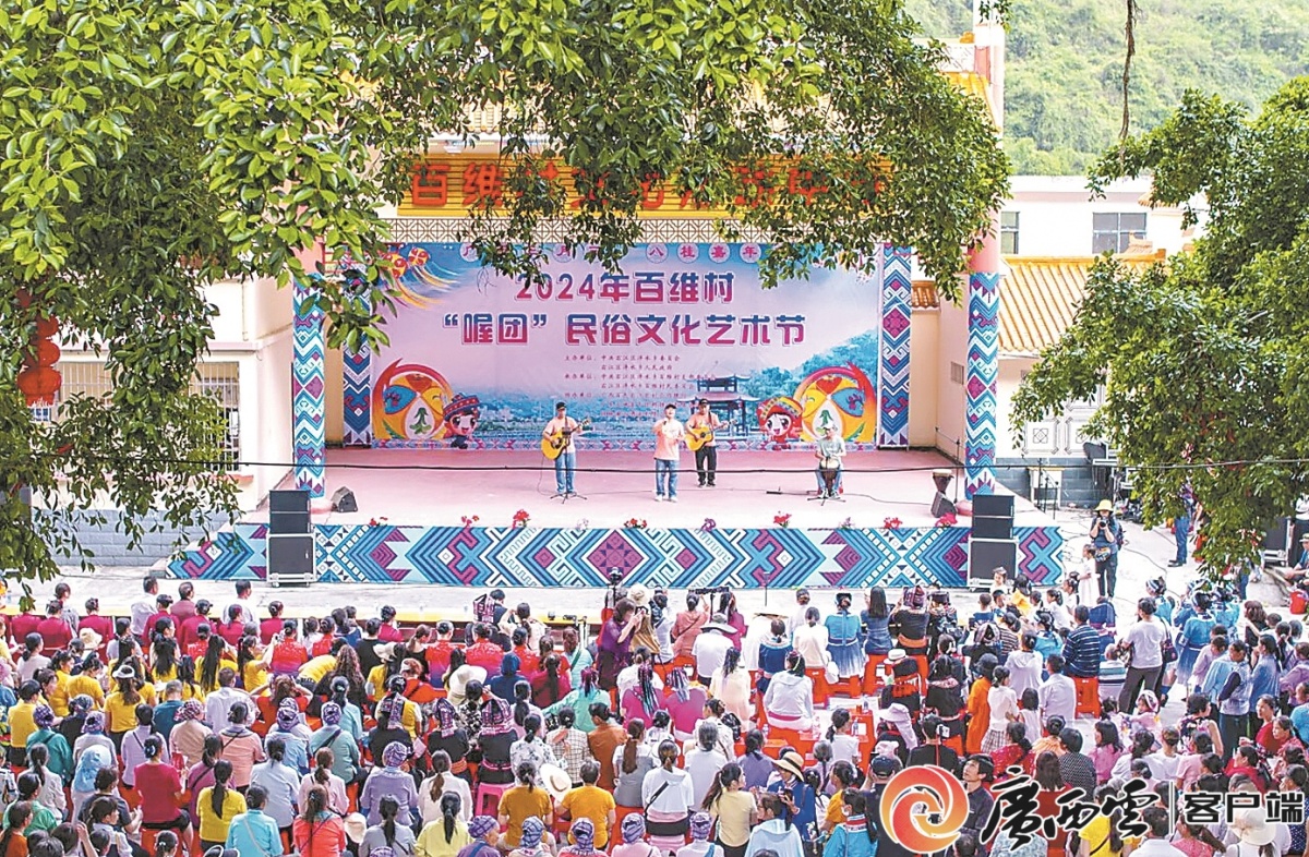 “五一”期间,百色市右江区泮水乡百维村开展民族盛装出游、竹竿舞比赛、山歌对唱、文艺表演等活动,吸引众多游客前来观看、体验。蓝庆侃 任小樱 摄