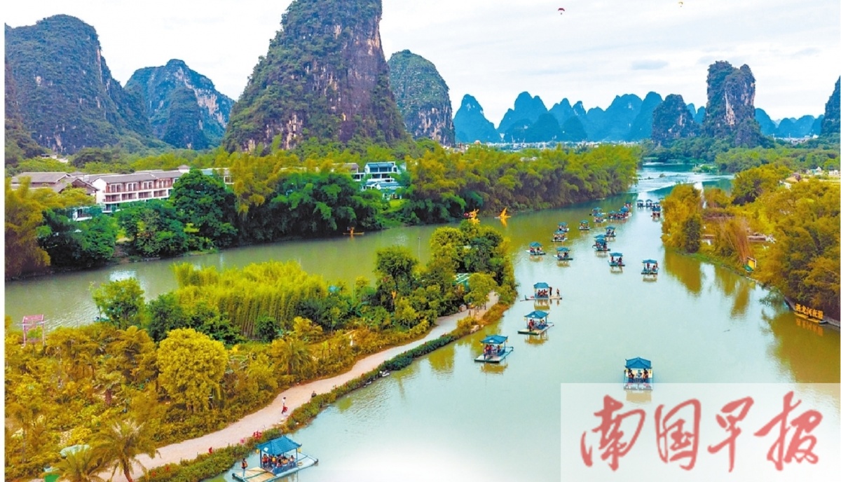 “五一”期间,不少游客来到阳朔县,通过坐竹筏、乘滑翔伞等方式饱览山水风光。刘峥 摄