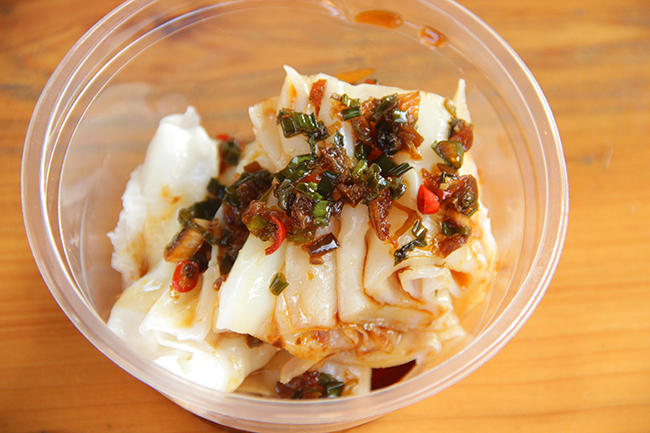 簸箕粉是榃僧村的一道特色美食,因其筋道爽滑的口感,深受食客青睐。将米浆薄薄一层摊在簸箕上,放入水滚的锅中蒸煮片刻,熟透的粉呈半透明状,趁热将其剥离,卷起切块装盘,淋上特制酱汁,一碗可口的簸箕粉就做好了。