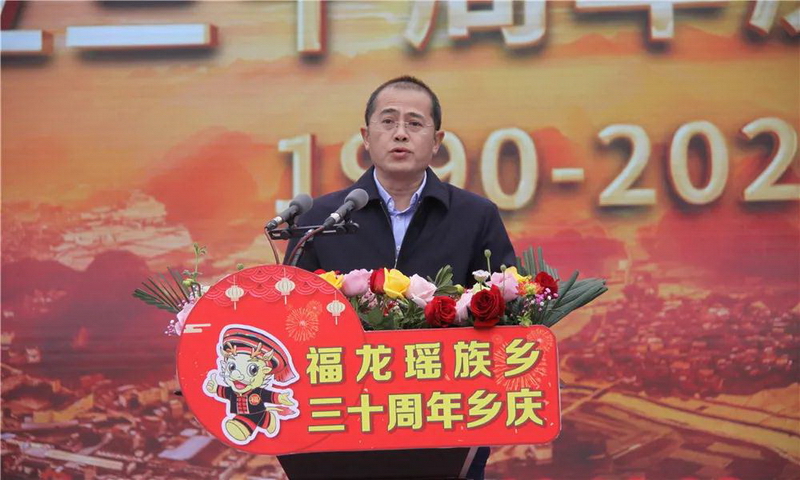 李振林代表自治区民宗委对该乡成立30年来所取得的各项成就表示祝贺。他指出,在全党全国人民正乘势而上,即将开启全面建设社会主义现代化国家新征程之际,福龙瑶族乡迎来了成立30周年纪念日,这是福龙各族人民政治生活中的一件大喜事。1990年,在党的民族政策光辉照耀下,福龙瑶族乡宣布成立,开启了各民族共同团结奋斗、共同繁荣发展的新征程,各项事业蓬勃发展,民族团结更加巩固,取得令人瞩目的成就。特别是党的十八大以来,福龙瑶族乡在各级党委、政府的领导下,坚持走中国特色社会主义道路,积极调整农业产业结构,大力发展特色扶贫产业,一批特色产业在“公司+合作社+基地+农户“的发展模式下蓬勃发展,产业覆盖率达95.5%。目前,全乡桑园面积达到2万亩,核桃种植面积达6.2万亩,油茶种植达到2130亩,花椒基地种植面积450亩;建有百头养牛场5个,千头养牛基地1个;顺利完成高山村、凤朝村等12个村的整村脱贫摘帽和3221户12337人贫困人口脱贫摘帽任务,贫困发生率从2015年的20.83%降至0;全乡城乡居民医疗保险参保率达98.7%;全乡895位老人享受高龄补贴,养老金发放率100%,低保、五保实现全面覆盖;通村道路硬化率达100%;电网改造、智慧广电、通讯网络覆盖全乡15个村(社区);建有村级文化活动中心14个,农家书屋15个,成立民间文艺代表队15支。今天的福龙,经济繁荣、社会进步、政治稳定、民族团结,呈现出生机勃勃、欣欣向荣的景象。福龙瑶族乡的发展变化,是党的创新理论科学指引的结果,是党中央、国务院和自治区党委、政府坚强领导的结果,是全乡各族干部群众和各有关方面砥励奋进、团结奋进的结果,充分彰显了中国特色社会主义制度的巨大优越性,充分展示了党的民族政策的伟大胜利。所有亲身经历福龙民族团结进步事业的干部群众,所有关心支持福龙改革发展的各界人士,都有理由为此倍感喜悦和自豪。