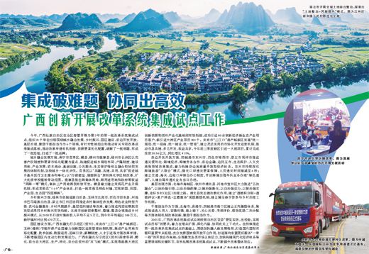 今年,广西壮族自治区在全区部署开展为期3年的第一批改革系统集成试点,组织21个单位分别围绕城乡融合发展、乡村振兴、园区建设、沿边开发开放、基层治理、激励干部担当作为6个领域,有针对性地组合和推动有关专项改革成果集成落地,推动改革举措有机衔接、资源要素优化配置,破解了一批难题,形成了一批经验,打造了一批品牌。