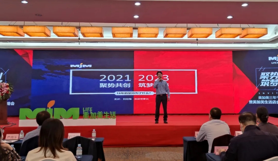 招商会上,美加美创始人董事长刘功锋先生在会上以《16年坚持为了什么?》为主题发言,围绕着美加美生活店在未来3年的战略发展布局,以及首次开放直营合伙模式展开,分享了16年间经历的零售行业变迁,以及将美加美生活店打造成为集家门口的美好生活、家门口的创业梦和多产业融合发展为一体的生活店愿望,未来三年,美加美将通过人才、供应链、数字化三大战略支撑公司扩张战略,并采用直营合伙模式开放美加美生活店合伙人招募,预计到2023年,门店规模达到1000家,覆盖广西14座城市,营收规模突破50亿元。刘功峰认为,服务业(三产汇用户需求)→反向订单→二产(农产品深加工)→一产(种养)→乡村振兴。美加美公司正在以行动助力乡村产业振兴。