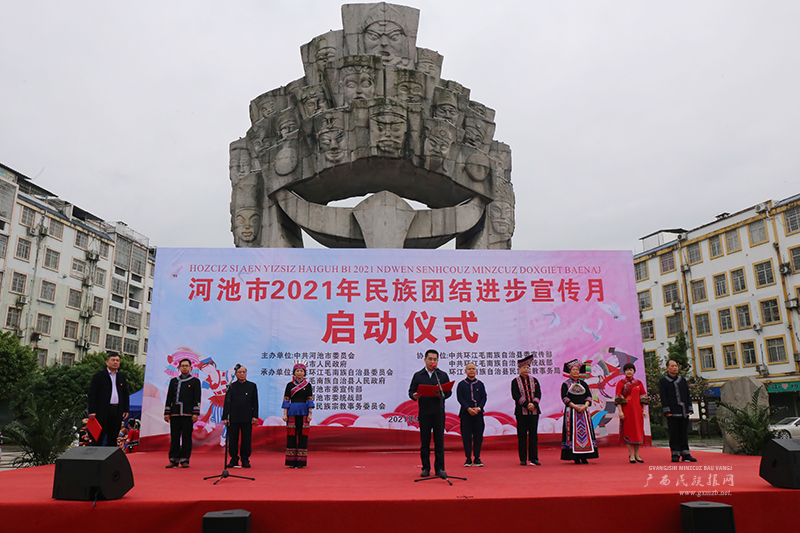(本报讯 记者 黄云 通讯员:欧庆)为喜迎建党100周年,大力宣传党和国家的民族政策,营造落实民族政策、维护民族团结的良好氛围,河池市2021年民族团结进步宣传月启动仪式于4月9日在环江毛南族自治县傩面广场举行。