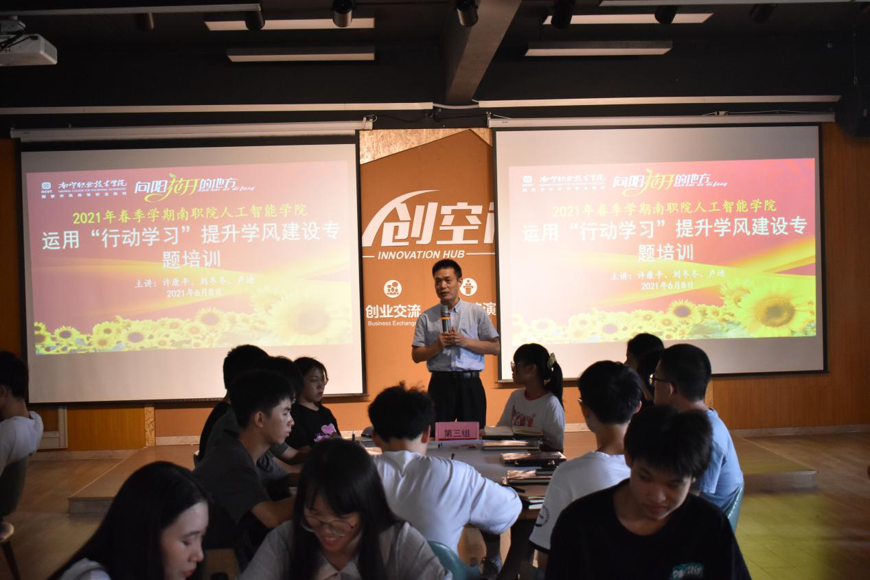 为贯彻落实党史教育主题活动“我为群众办实事“具体实践要求,进一步促进高职院校学风建设,解决班级学风不浓厚这一问题,提高师生运用行动学习解决实际问题的能力和水平,南宁职业技术学院人工智能学院大胆创新、先行先试,2021年6月8日,邀请到了南职院国际学院许康平教授及其团队一行三人到会指导和授课,此次活动由学生管理中心主任舒祥荣主持,学院辅导员教师及各班级学生干部共100多人参加此次培训。