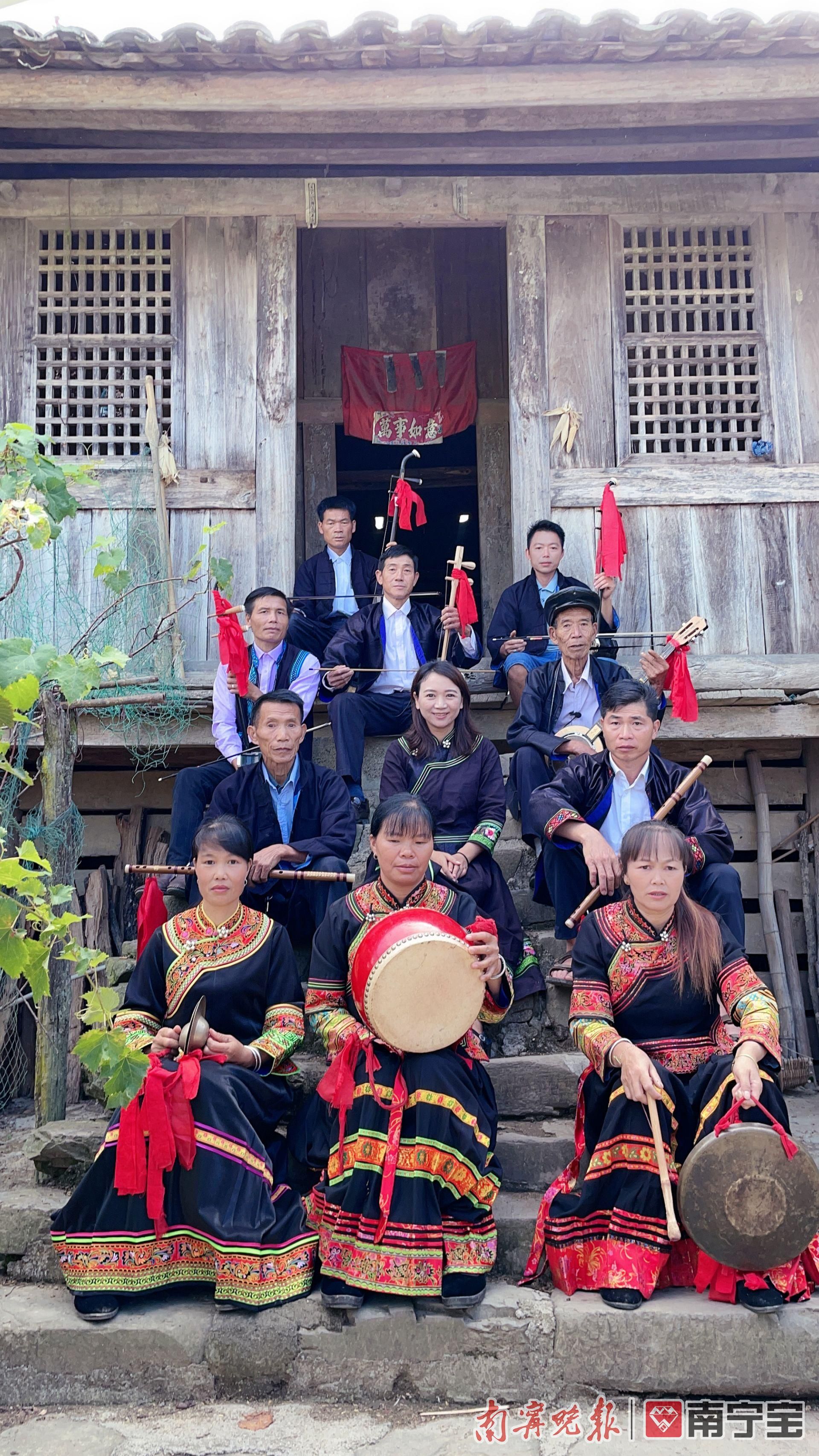 蒋凤(第二排中)在隆林者徕村那利屯直播丰收节的壮乡八音