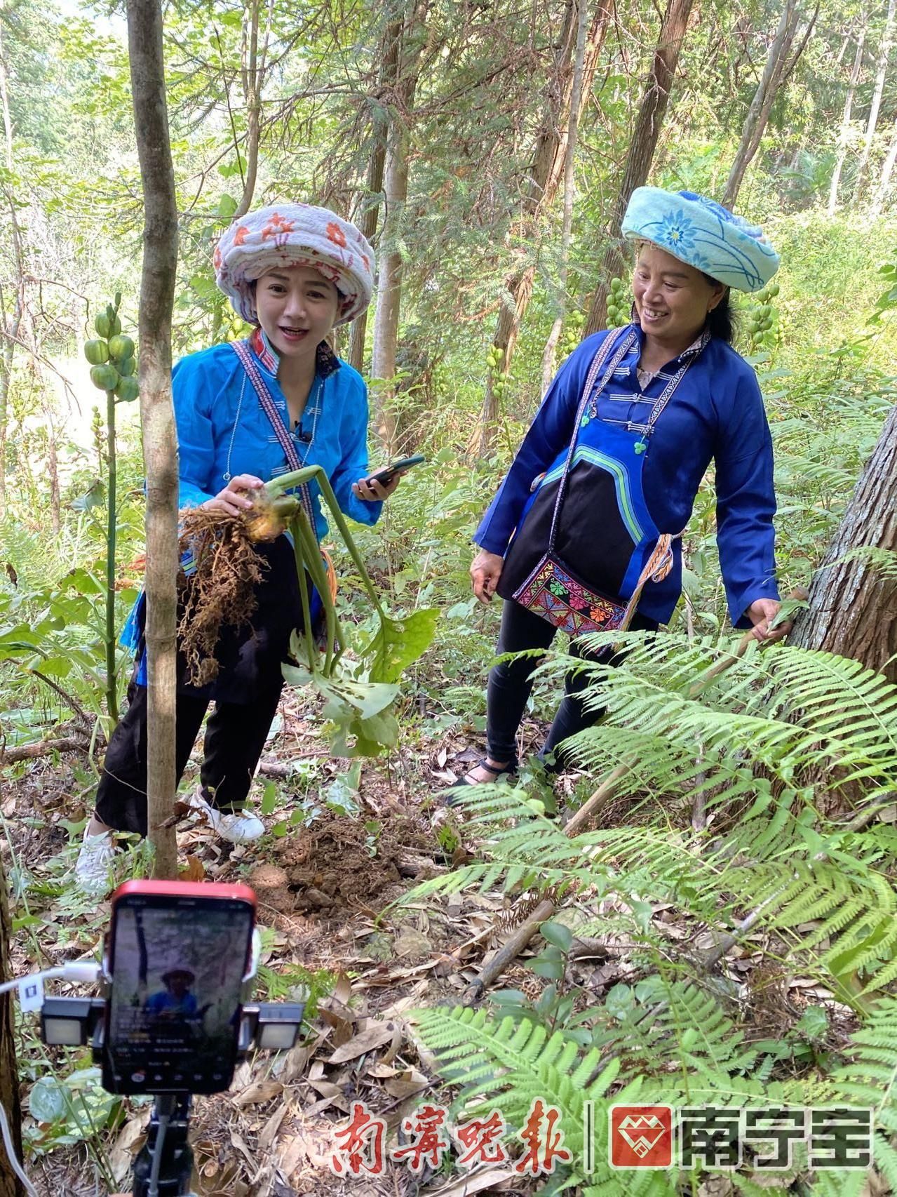 蒋凤(左)在龙胜盘瑶寨直播挖野生野百合