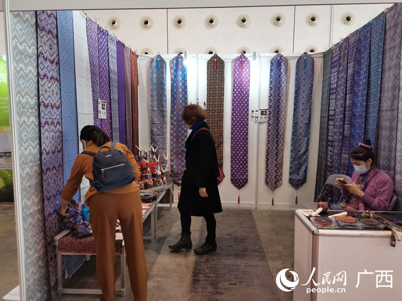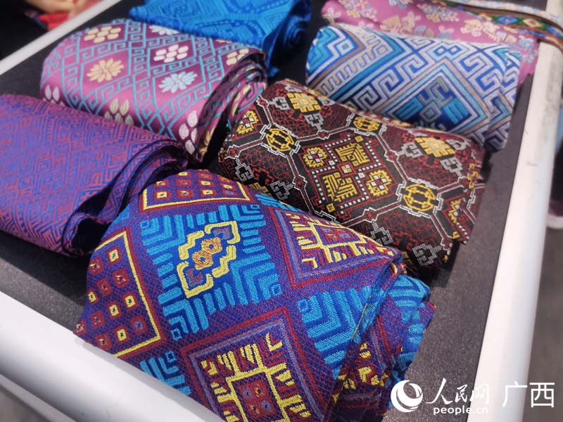 壮锦手工艺品吸引游客驻足。人民网 黄子婧摄