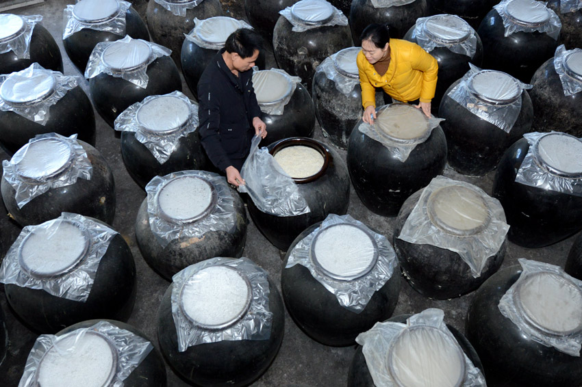 据介绍,精心选取本地优质稻米和山泉水,经过烧饭、上曲、发酵、烧锅、蒸煮等传统工序,带着稻米芬芳的醇香米酒就新鲜出炉。近年来,龙头村在人大代表引领下掀起了酿酒的创业热潮,目前全村已有酒坊46家,年产值400多万元。“采用传统工艺酿造、经过地窖收藏的米酒很受欢迎。回乡过年的乡亲,总说这米酒有着乡愁的味道……“容县人大代表李林强说。