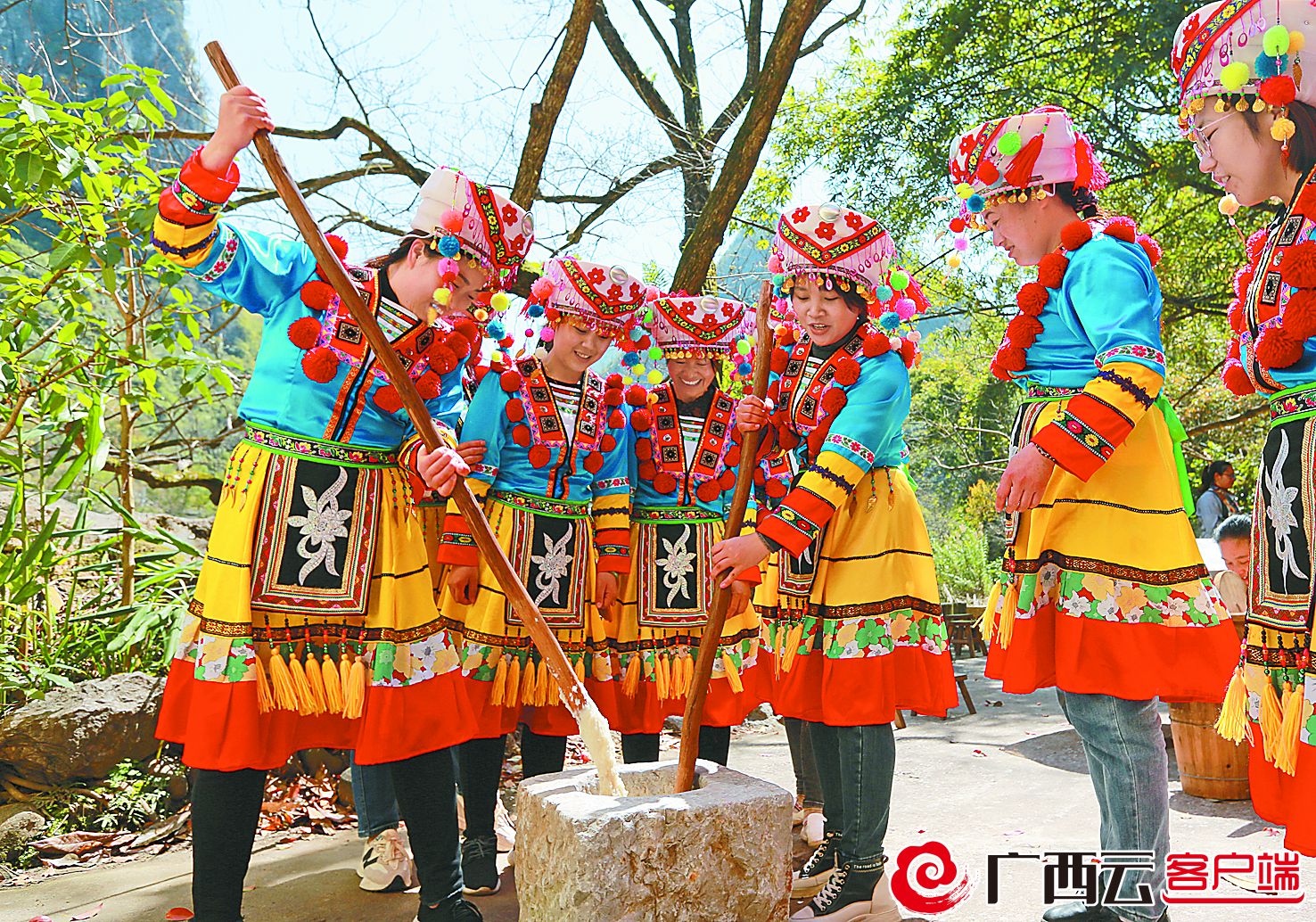 3月7日,灵川县大境瑶族乡的少数民族妇女们欢聚在灯明村,以绣国旗、唱山歌、打糍粑等形式,共庆“三八“国际妇女节。卢运向 王道梅 摄