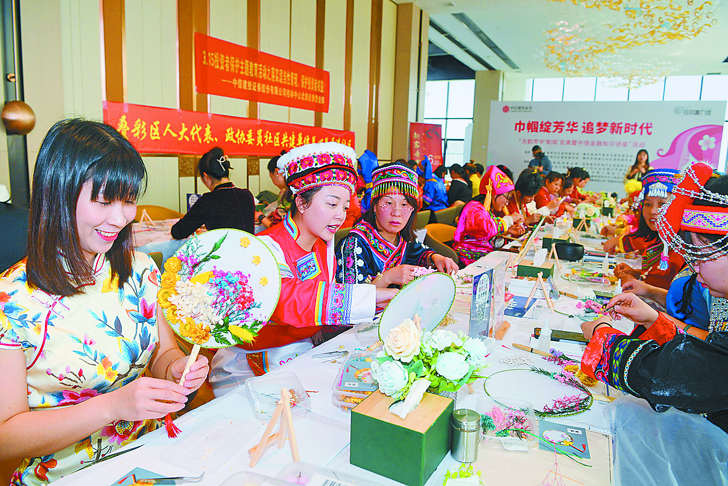 3月8日“三八“国际妇女节,桂林市清秀、芦笛、燕湖、虞山社区共同举办“古韵芳华‘制扇’至美“主题活动,邀请辖区妇女党员干部群众代表共同制作干花团扇。唐艳兰 摄